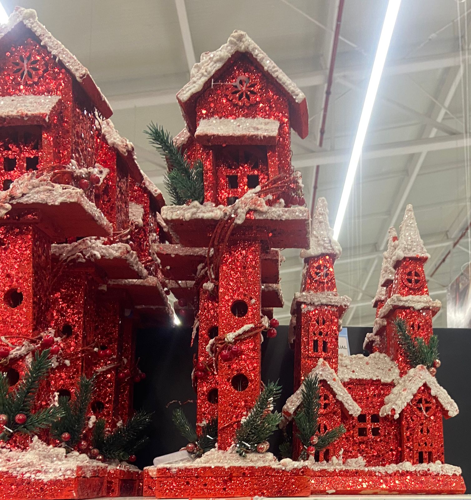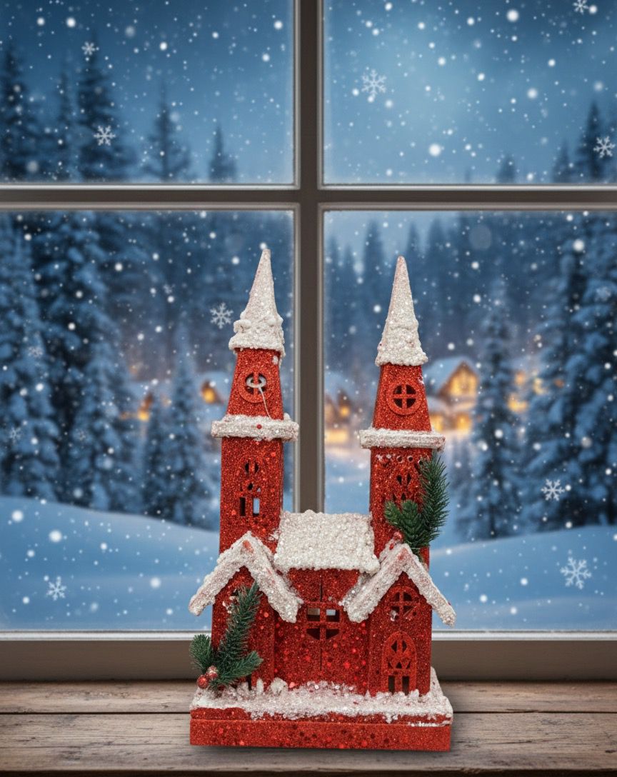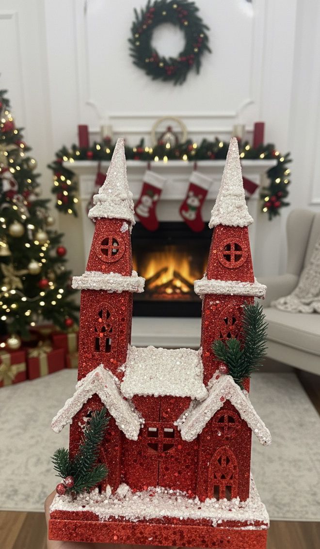 Presentamos la Catedral Escarchada Carmín, una pieza central majestuosa que captura la esencia de la Navidad clásica. Esta imponente estructura de doble torre, bañada en un vibrante color rojo carmín y generosamente cubierta con nieve escarchada brillante (glitter), promete ser el punto focal de cualquier decoración festiva.